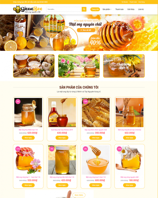 Website Mật ong gồm các tính năng: trang chủ, giới thiệu, thanh toán, liên hệ, tìm kiếm, cửa hàng, liên hệ