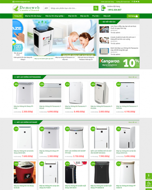 Website máy lọc khí 2 gồm các tính năng: trang chủ, giới thiệu, các loại máy lọc khí, sản phẩm, giỏ hàng, tìm kiếm, hướng dẫn thanh toán, liên hệ